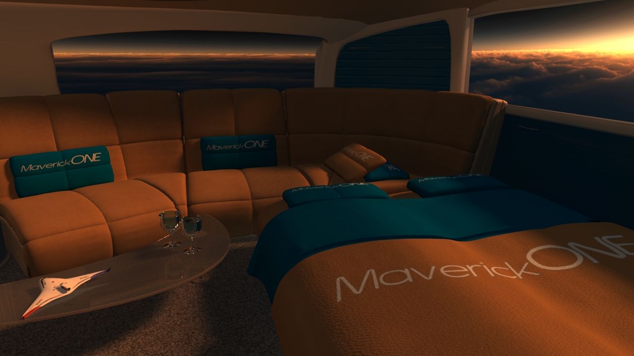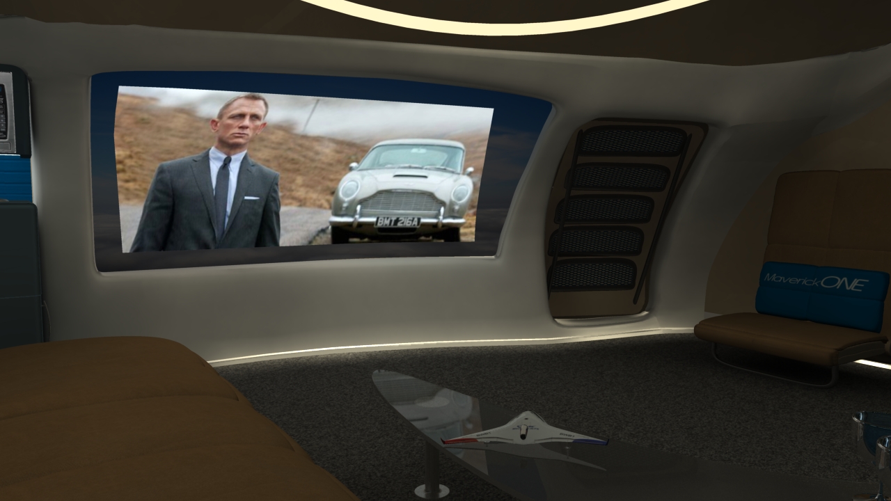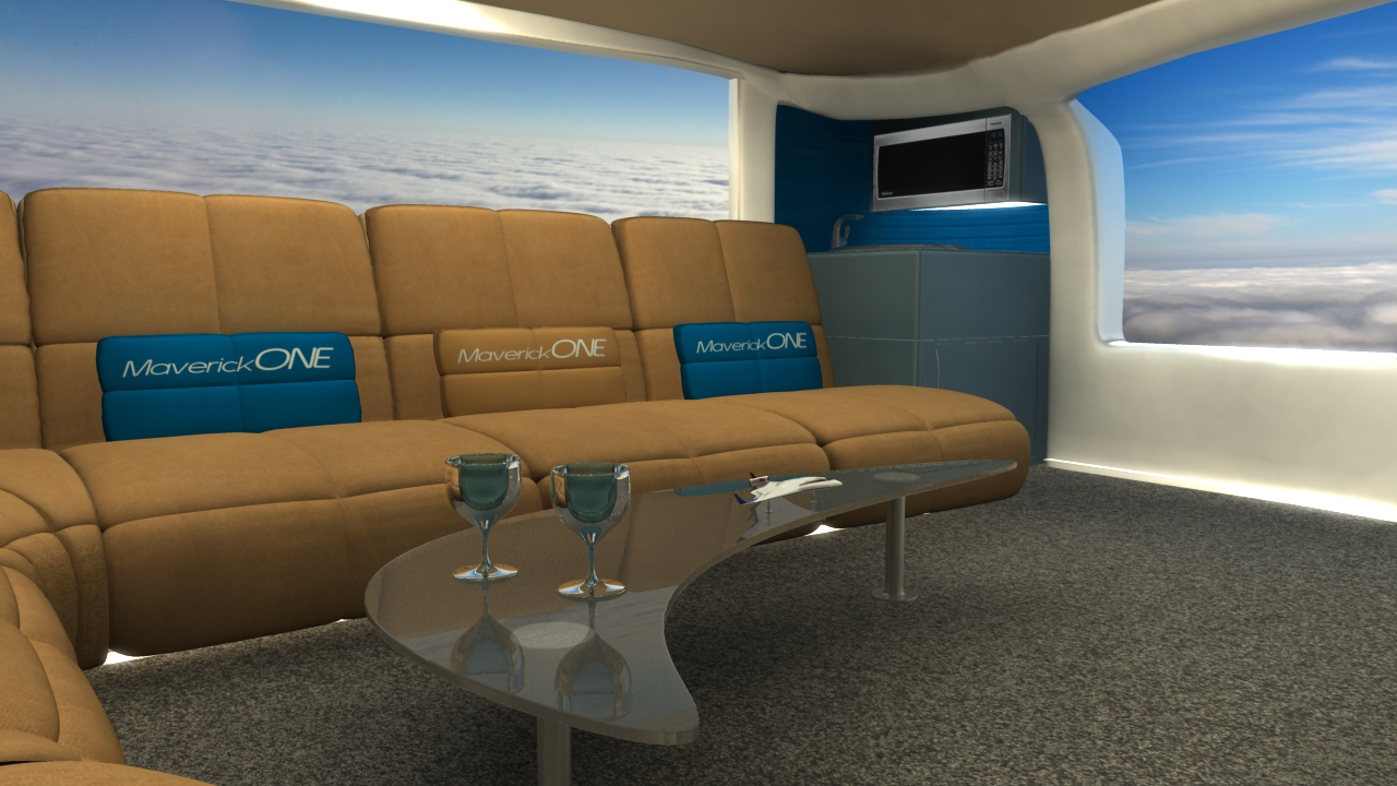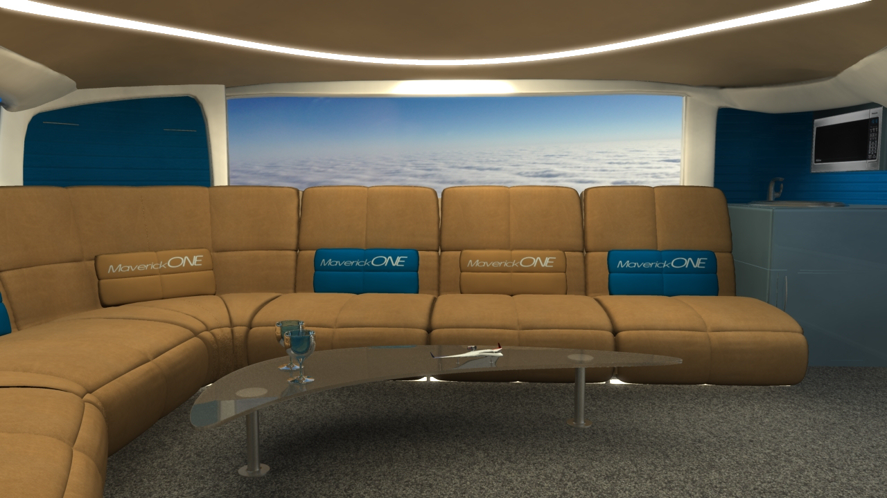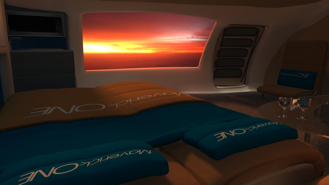 Business and entertainment flying in MaverickONE will also become a whole new galactic experience. Welcome to the revolutionary new jet travel interior of MaverickONE  … open wide expanding cockpit, massive interior, large screen business computer deal-making, large screen movie entertainment, first class sleeper beds, and all with Totalview Windows to see the world below or the stars at night: