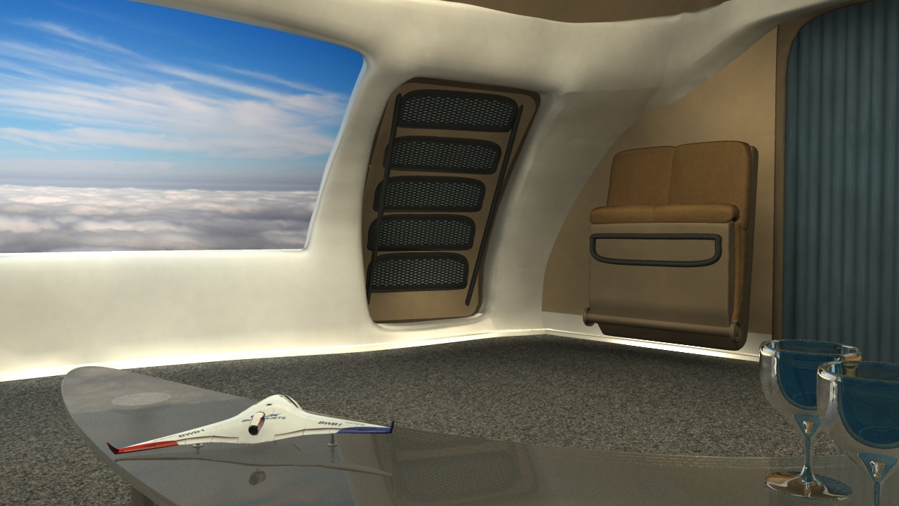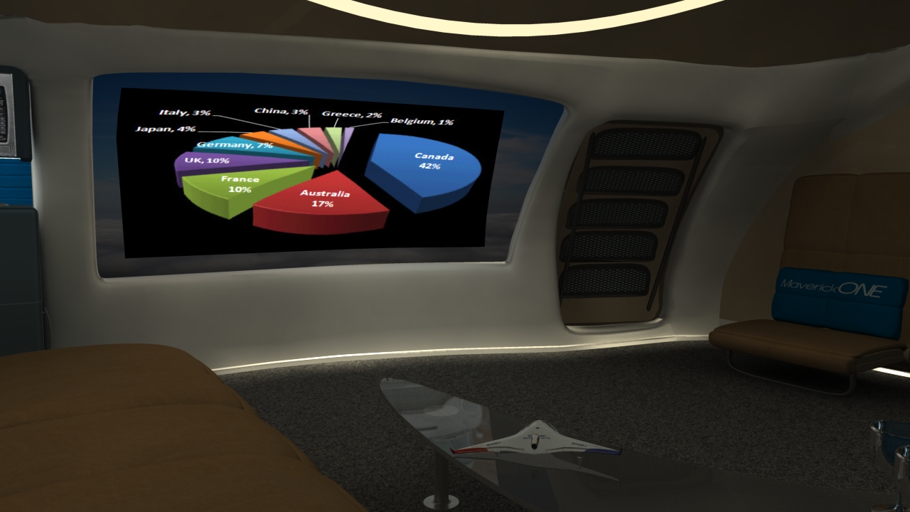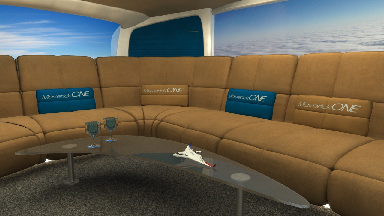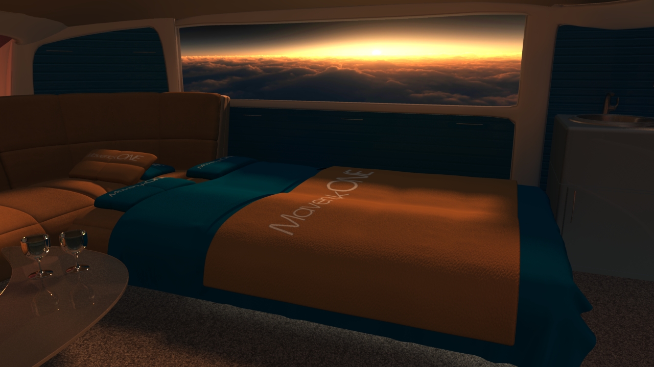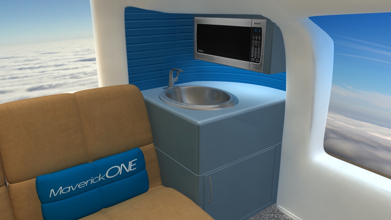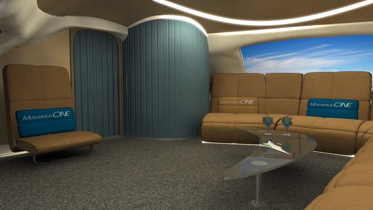 Business and entertainment flying in MaverickONE will also become a whole new galactic experience. Welcome to the revolutionary new jet travel interior of MaverickONE  … open wide expanding cockpit, massive interior, large screen business computer deal-making, large screen movie entertainment, first class sleeper beds, and all with Totalview Windows to see the world below or the stars at night: